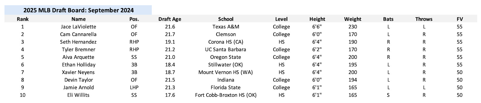 With the end of the 2024 Major League Baseball season fast approaching, it is a good time to start preparing for the events on the baseball calendar next year, such as the 2025 Major League Baseball Draft. Over the past two seasons, I published analysis on top draft prospects such as Chase Burns, Hagen Smith, Walker Jenkins, Chase Dollander, and Trey Yesavage, and I am planning on expanding my draft coverage over the next year and going into greater detail in analyzing the top draft prospects in amateur baseball. The first installment of this series will be this post, the publication of my first draft board of the Top 10 prospects in the 2025 MLB Draft at the present moment. This board will be expanded and elaborated upon more as the upcoming season progresses, and the goal is to have a comprehensive and interactive draft board available come draft day next season. With that being said, onto the draft board!