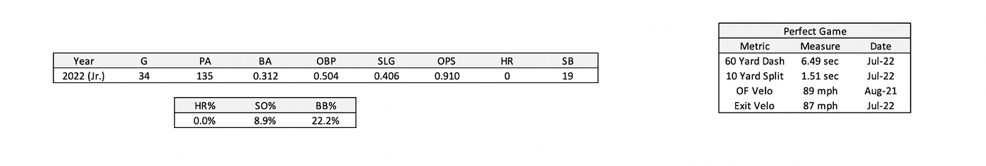 Taking a look at West’s statistics from this past high school season, Dean slashed .312/.504/.406, with 0 home runs and 19 stolen bases in 34 games. Dean also produced a walk rate of 22.2% and a strikeout rate of 8.9% in 135 plate appearances for Notre Dame High School in Sherman Oaks, CA. Statistics from a high school baseball season provide an incredibly small sample size, and top prospects are expected to post gaudy numbers in such a short season due to the lack of quality pitching. However, a few takeaways can be taken out of Dean West’s 2022 high school season. First off, West’s lack of home runs in 2022 (and 2021), is a bit concerning at the moment as it indicates that he will need to add some muscle in order to hit for power at the professional level. While it can be expected that every amateur player will need to add some level of strength in order to succeed at the next level, the fact that West has not been able to hit home runs against low quality pitching limits his potential in this area in my opinion. On a positive note, West’s high walk rate and high on-base percentage indicates that he has good plate discipline, which is a positive indicator that at least some level of his offensive production will translate to professional baseball.