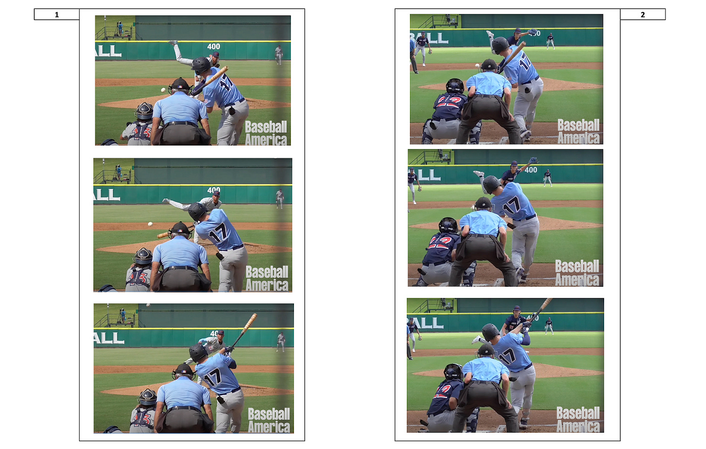Another element of Jenkins’s offensive approach that I was impressed by was his ability to hit the ball to all fields. The images below display the point of contact from two of Jenkins’s batted ball events during the games featured in the Baseball America video.