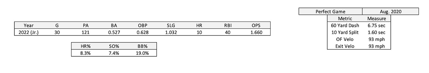 Courtesy of Perfect Game, Jenkins displays exit velocity, arm strength, and sprint speed that places him amongst the top prospects in his class, indicating that he has high-level upside as a Major League outfielder. These metrics were captured in August 2020, and it can be assumed that these results have improved in the succeeding two seasons, however it would be valuable if more recent data was publicly available.