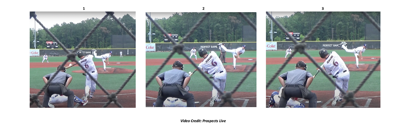The images above display the point of contact from three of Jenkins’s batted ball events during the game featured in the Prospects Live video. Jenkins’s ability to make contact in the upper, middle, and lower parts of the zone (especially during the same game) is impressive and indicates that he has the potential to produce in all parts of the strike zone. Particularly impressive is how in all three at-bats (especially the at-bat in image 1), Jenkins is able to effectively make the adjustment mid-flight and approach the pitch with a proper attack angle. While simply viewing one game is an incredibly small sample size, Jenkins ability to effectively produce swing-to-swing variation indicates that Jenkins has the potential to produce in all parts of the strike zone in the future.