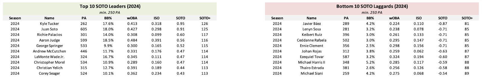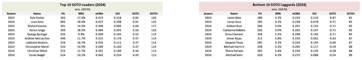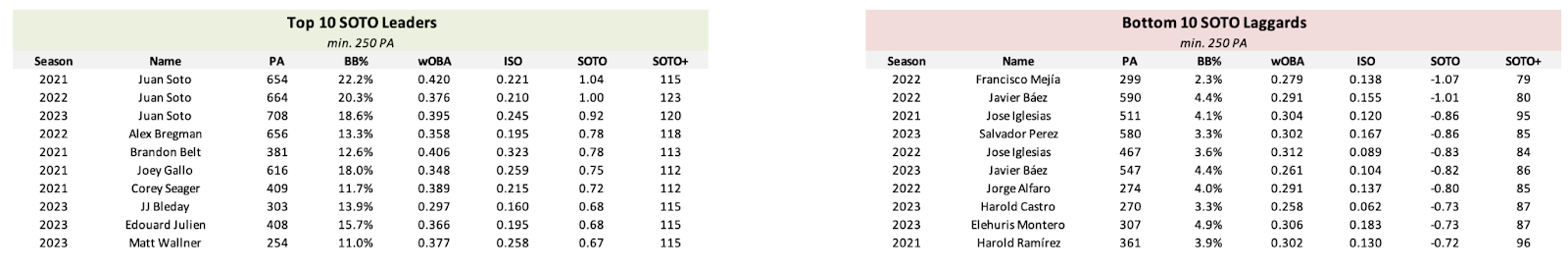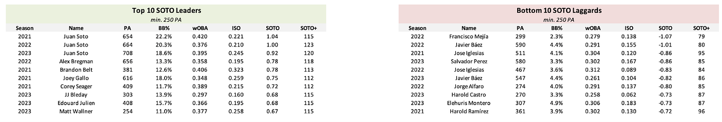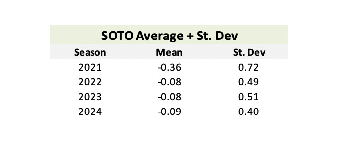 For the leaderboards, I calculated the SOTO and SOTO+ for each hitter from the 2021, 2022, 2023, and 2024 seasons. In these leaderboards, 2024 data runs through August 31st. Here are the top 10 SOTO leaders and bottom 10 SOTO laggards from the past three full seasons: