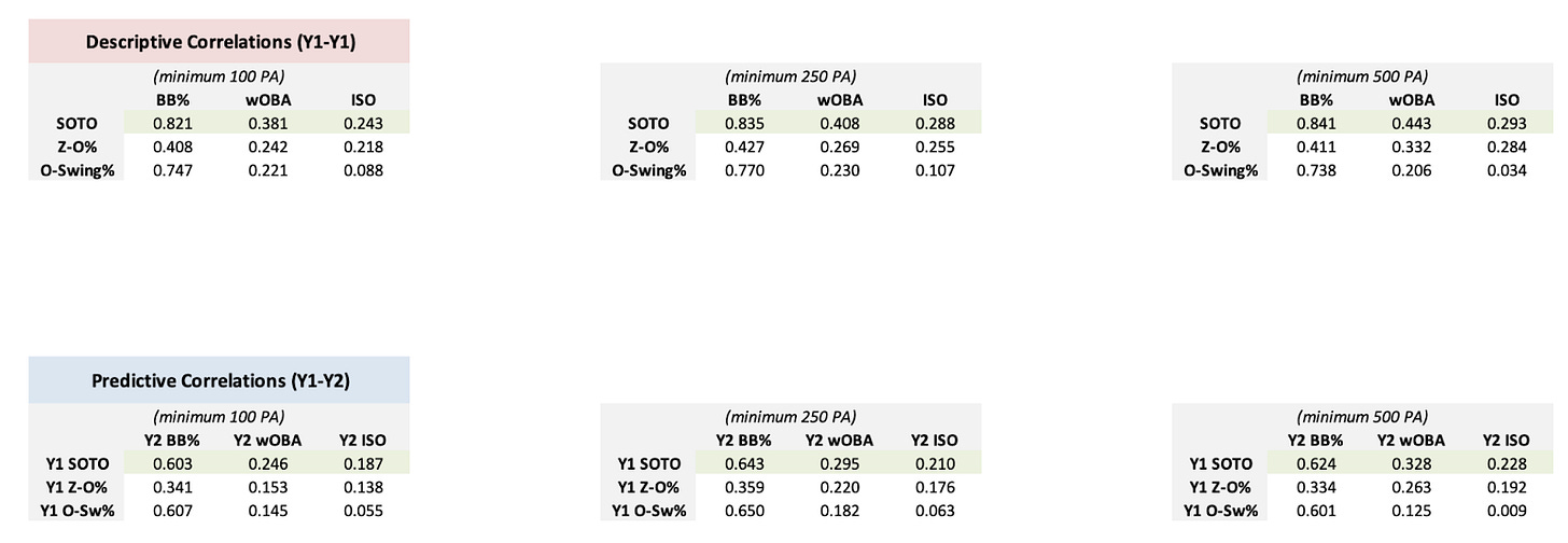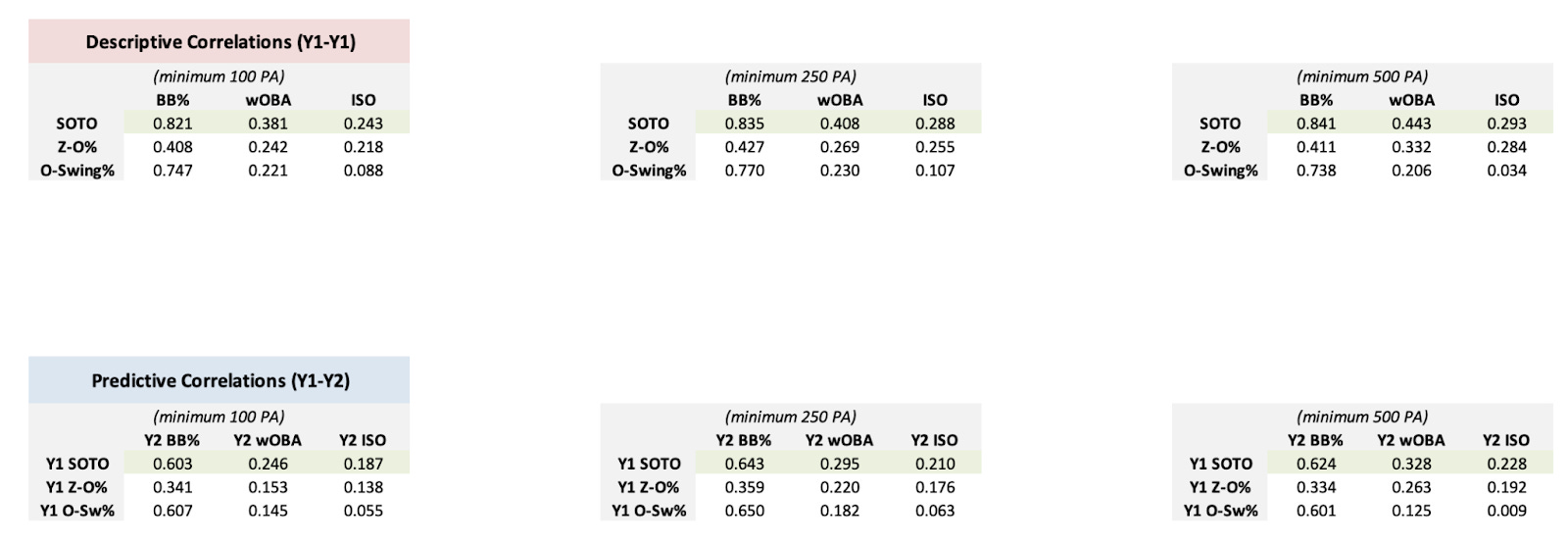 Creating a model whose results make intuitive sense is only one step of the equation. Ensuring that the model is able to predict future performance, as well as describe the current performance of a hitter regarding their swing decisions is the real value of creating a model like SOTO. To measure the descriptive and predictive abilities of my swing decision model, I will evaluate the correlations of SOTO, O-Swing%, and Z-O Swing% with BB%, wOBA, and ISO. I will construct three separate tables for each analysis, grouped by minimum plate appearances (100, 250, and 500). For the descriptive analysis, I will compare Y1 data to itself, while I will compare Y1 data to Y2 for the predictive analysis.