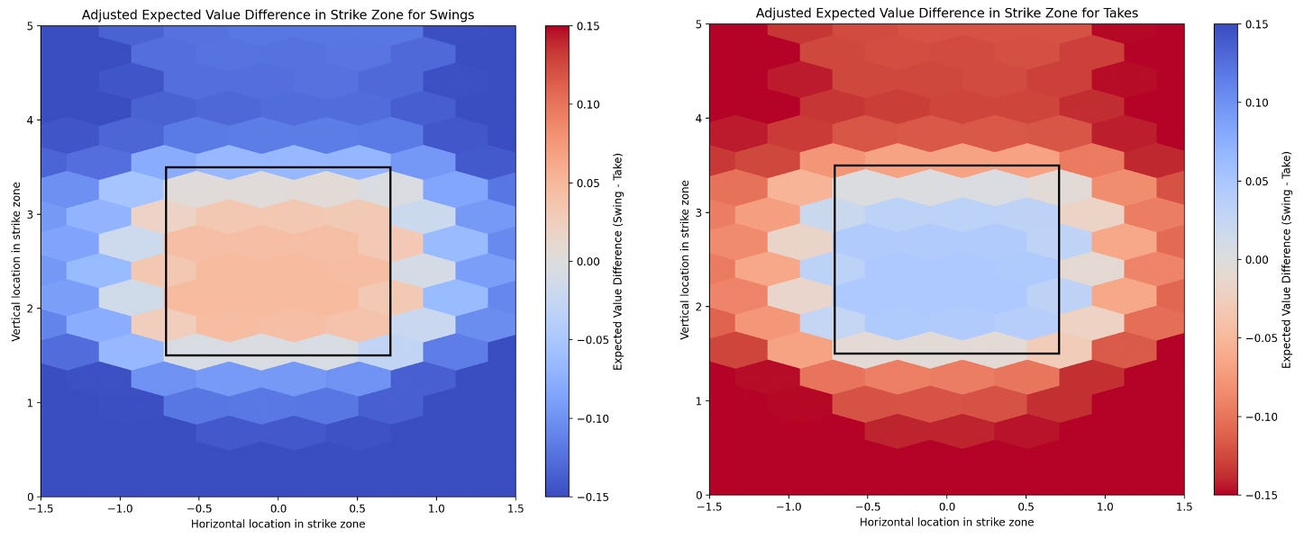 The table above displays the feature importance of all the variables in the XGBoost regression models for swings and takes. As expected, the location and count of each pitch are significant variables in predicting the expected run value of each swing or take. Unlike my pitch quality model, there are not many interesting takeaways to draw from the feature importance, given the limited number of variables utilized as predictors in the model. To further demonstrate the impacts these variables have on the model, I applied the swing and take model to all pitches in my dataset, took the difference in expected run value between these two models, and created the following plot to illustrate the locations within the strike zone where swings and takes are more favorably valued.