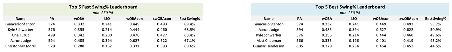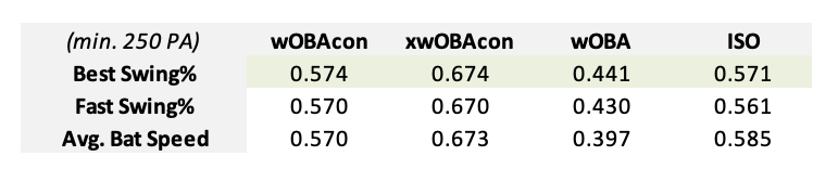 As shown by the correlation table above, Best Swing% is a marginally better metric at describing wOBAcon, xwOBAcon, wOBA, and ISO than Fast Swing%. Best Swing% is also a better metric at describing wOBAcon, xwOBAcon, and wOBA than average Bat Speed. While bat tracking metrics are still in their infancy on the public side, with the release of more metrics such as contact point and year-to-year data needed in order to create effective descriptive and predictive swing models, the performance of Best Swing% indicates that there is demonstrable value in taking “fast swings” at pitches in ideal locations.