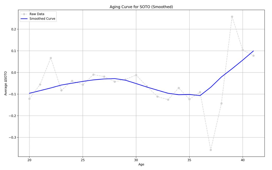 Another means of utilizing a swing decision model like SOTO can be as a tool to project how well or poorly a player’s swing decisions can be expected to age over the course of their career. To analyze how a player’s swing decisions age over the course of their career, I constructed a simple aging curve, utilizing the “delta method” to analyze each player’s year-to-year difference in SOTO, grouped by age. To enhance the interpretability of the aging curve, I also implemented LOWESS to create a smoothed aging curve.