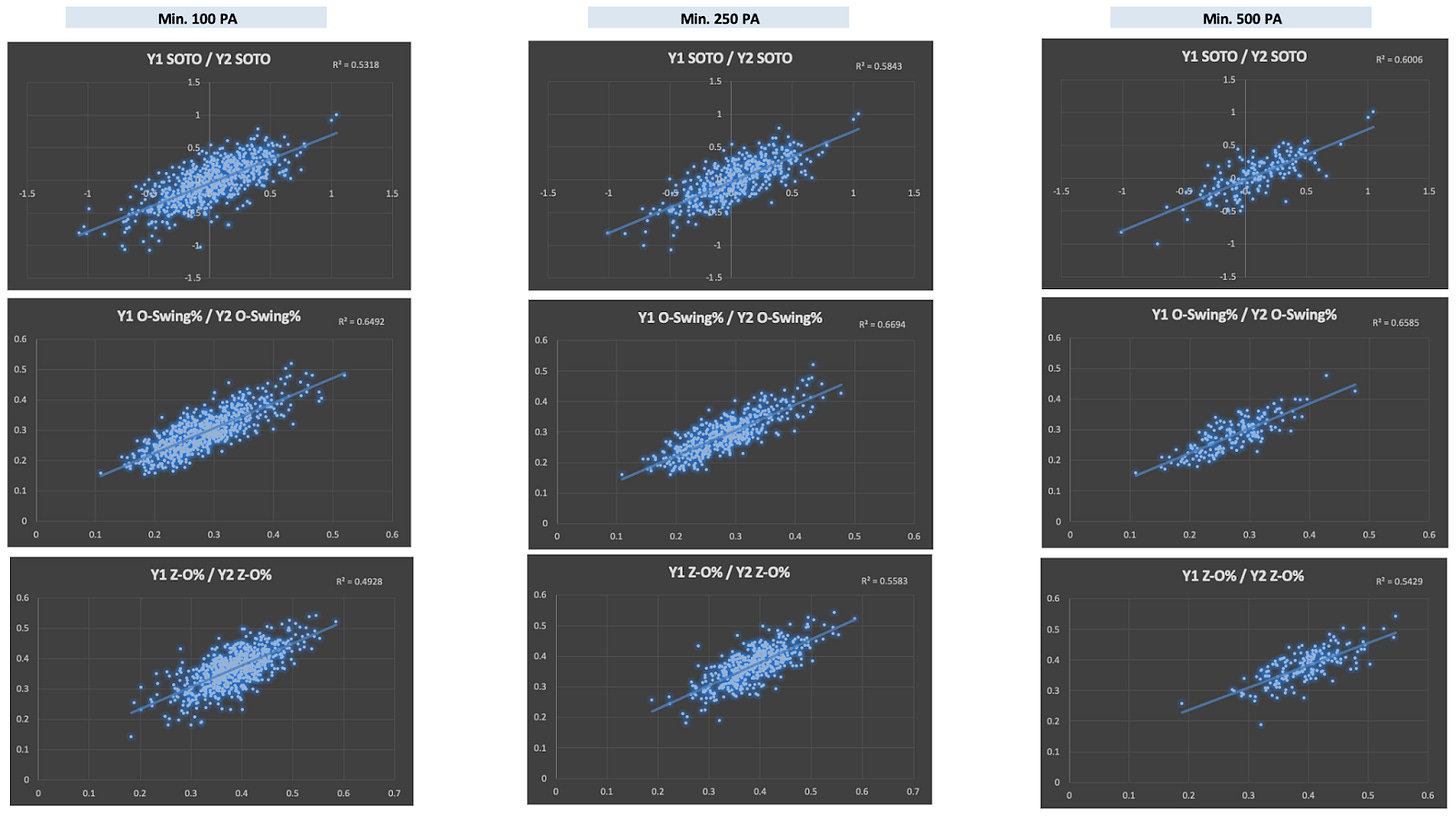 For use as a predictive statistic, it is important that SOTO is able to be “sticky” and have the ability to predict itself year-to-year. To calculate the stickiness of SOTO, I conducted a simple linear regression of year-to-year SOTO to evaluate how much variance in Y2 SOTO can be explained by Y1 SOTO. For comparison, I also conducted regressions to evaluate the stickiness of O-Swing% and Z-O Swing%. Similar to the descriptive/predictive analysis, I ran three separate regressions for each metric, grouped by minimum plate appearances (100, 250, and 500).