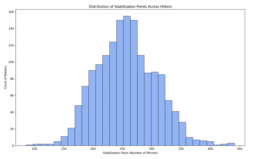 As shown by the table above, this analysis indicates that the median stabilization point for SOTO is approximately 255 pitches. Assuming that each plate appearance averages 5 pitches, this would indicate that the median stabilization point for SOTO would be 51 plate appearances.
