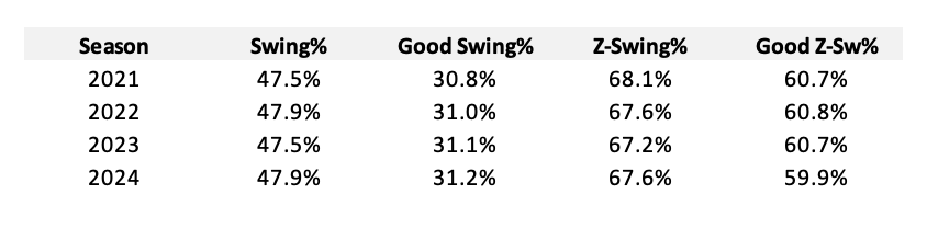Plate discipline and swing decisions are currently evaluated in the public sphere using a variety of different metrics. Two prominent metrics include O-Swing% (or “chase rate”), dividing a player's swings out of the strike zone by the number of pitches faced outside of the strike zone, and Z-O Swing%, which takes a hitter’s in-zone swing minus their chase rate. O-Swing% is generally thought of as an effective predictor for walk rate, as takes out of the zone will nearly always result in balls, while Z-O Swing% is thought of as a means to measure a player’s overall swing decisions, as the best offensive outcomes are a product of swinging the bat.