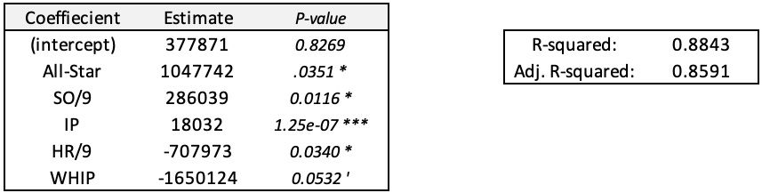 In the linear regression model of the 32 starting pitchers in the dataset, there is a statistically significant relationship between the amount of a player’s awarded raise and their SO/9, HR/9, Inning Pitched, and WHIP from the previous season, and whether or not they were an All-Star during the preceding season. These five variables are able to explain 88.4% of the variance in player’s arbitration raises for starting pitchers. Appearing in an All-Star Game in the preceding season has a particularly significant effect on a player’s salary, as the player can expect a raise of $1,047,742 as a result. Each 1.0 increase in SO/9 and HR/9 during the previous season is worth $286,039 and -$707,973, respectively, each Inning Pitched can expect a raise of $18,032, and each 0.10 increase in WHIP decreases a player’s raise by $165,012.