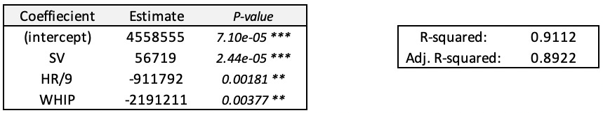 In the linear regression model of the 18 relief pitchers in the dataset, there is a statistically significant relationship between the amount of a player’s awarded raise and their Saves, HR/9, and WHIP from the previous season. These three variables are able to explain 91.1% of the variance in player’s arbitration raises for starting pitchers. Each save a relief pitcher earns in the preceding season has a particularly significant effect on a player’s salary, as the player can expect a raise of $56,719 per each save as a result. Each 1.0 increase in HR/9 during the previous season decreases a player’s raise by $911,792, and each 0.10 increase in WHIP decreases a player’s raise by $2,191,211.