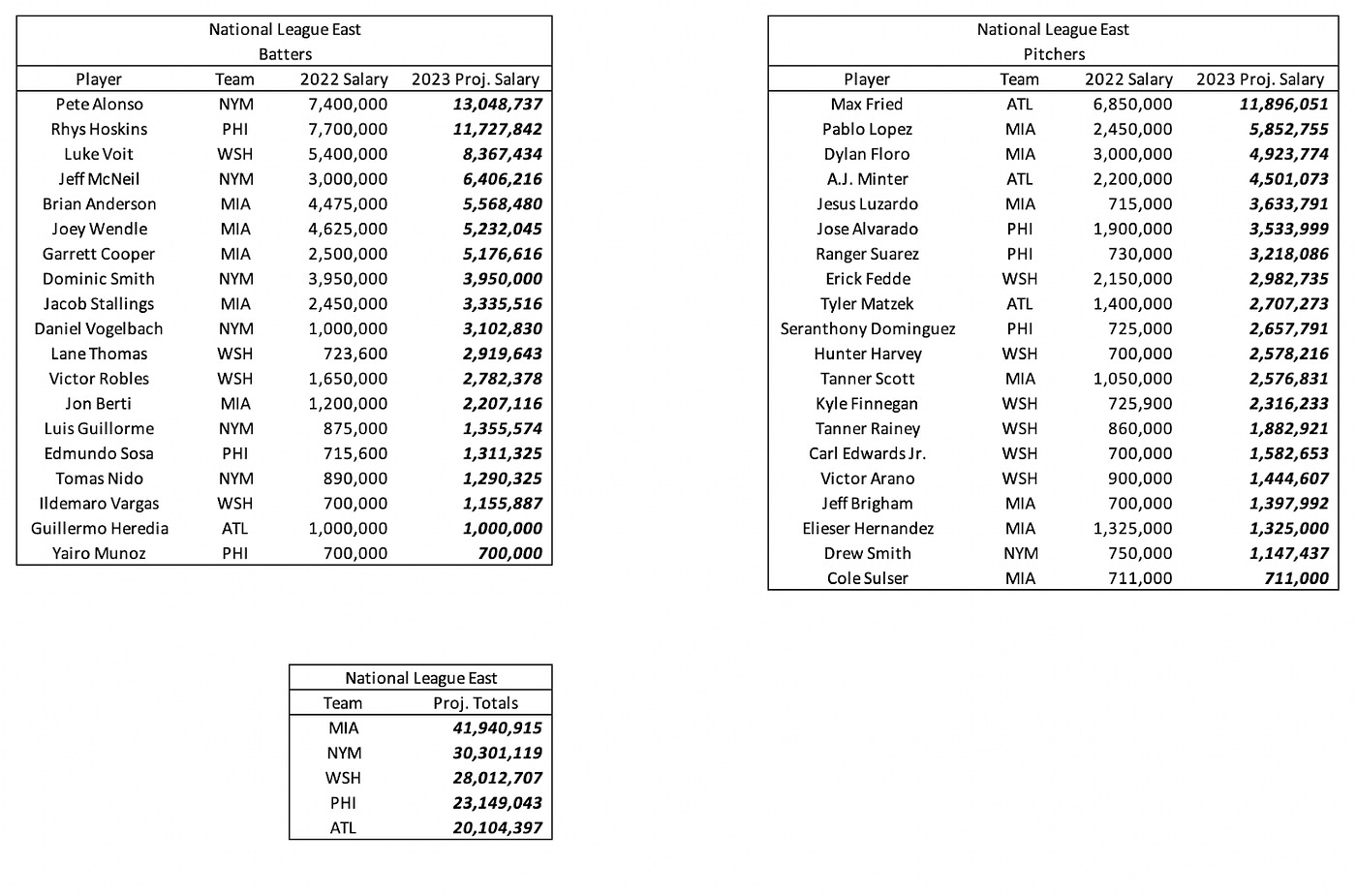 Below are the projected 2023 salaries for arbitration-eligible players in the National League East.