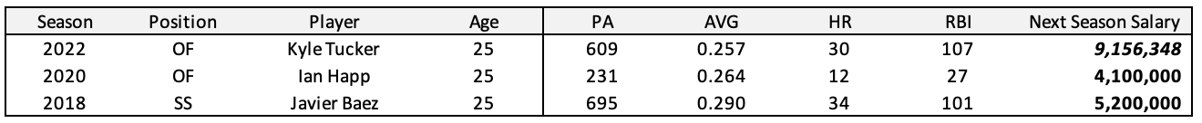 Two players who also entered arbitration for the first time after their age-25 season were Javier Baez (2018) and Ian Happ (2020).