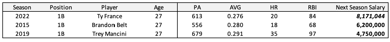 Two first basemen who also entered arbitration after their age-25 seasons were Brandon Belt (2015) and Trey Mancini (2019).