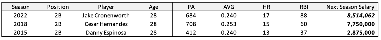 Two second basemen who also entered arbitration for the first time after their age-28 season were Cesar Hernandez (2018) and Logan Forsythe (2015).