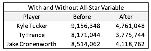 One group of players that stood out to me after completing these projections were the first-time eligible offensive players who appeared in this year’s All-Star Game (Kyle Tucker, Ty France, and Jake Cronenworth). While these players are due for substantial raises next season due to the extraordinary starts to their Major League careers, the projections that the arbitration model forecasted for them seemed too large compared to arbitration modeling conducted by other analysts (such as MLBTR’s Matt Swartz). To further analyze projected raises for these players next season, I will compare each player with two similar players who entered arbitration at the same age.