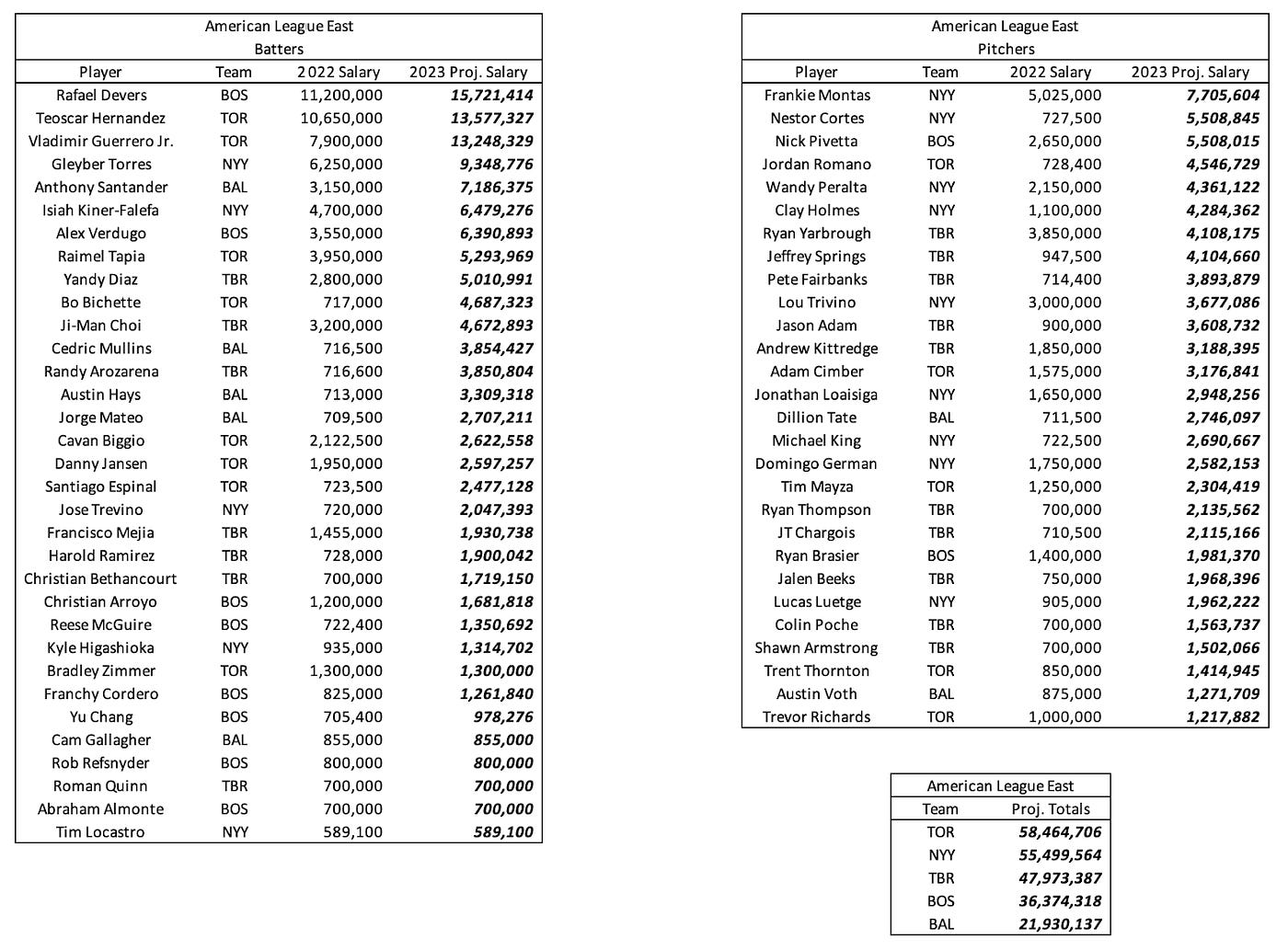 Below are the projected 2023 salaries for arbitration-eligible players in the American League East.