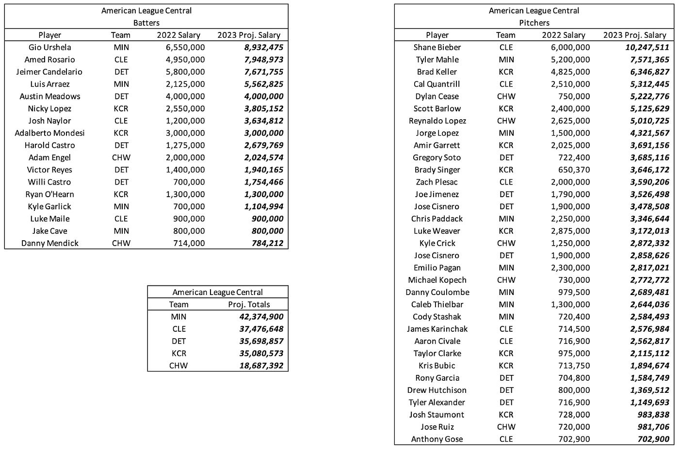 Below are the projected 2023 salaries for arbitration-eligible players in the American League Central.
