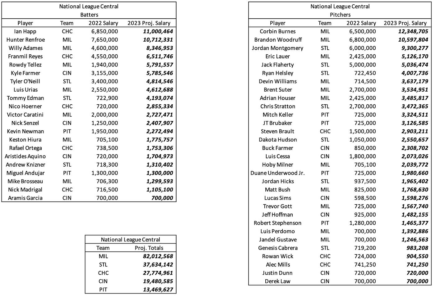 Below are the projected 2023 salaries for arbitration-eligible players in the National League Central.