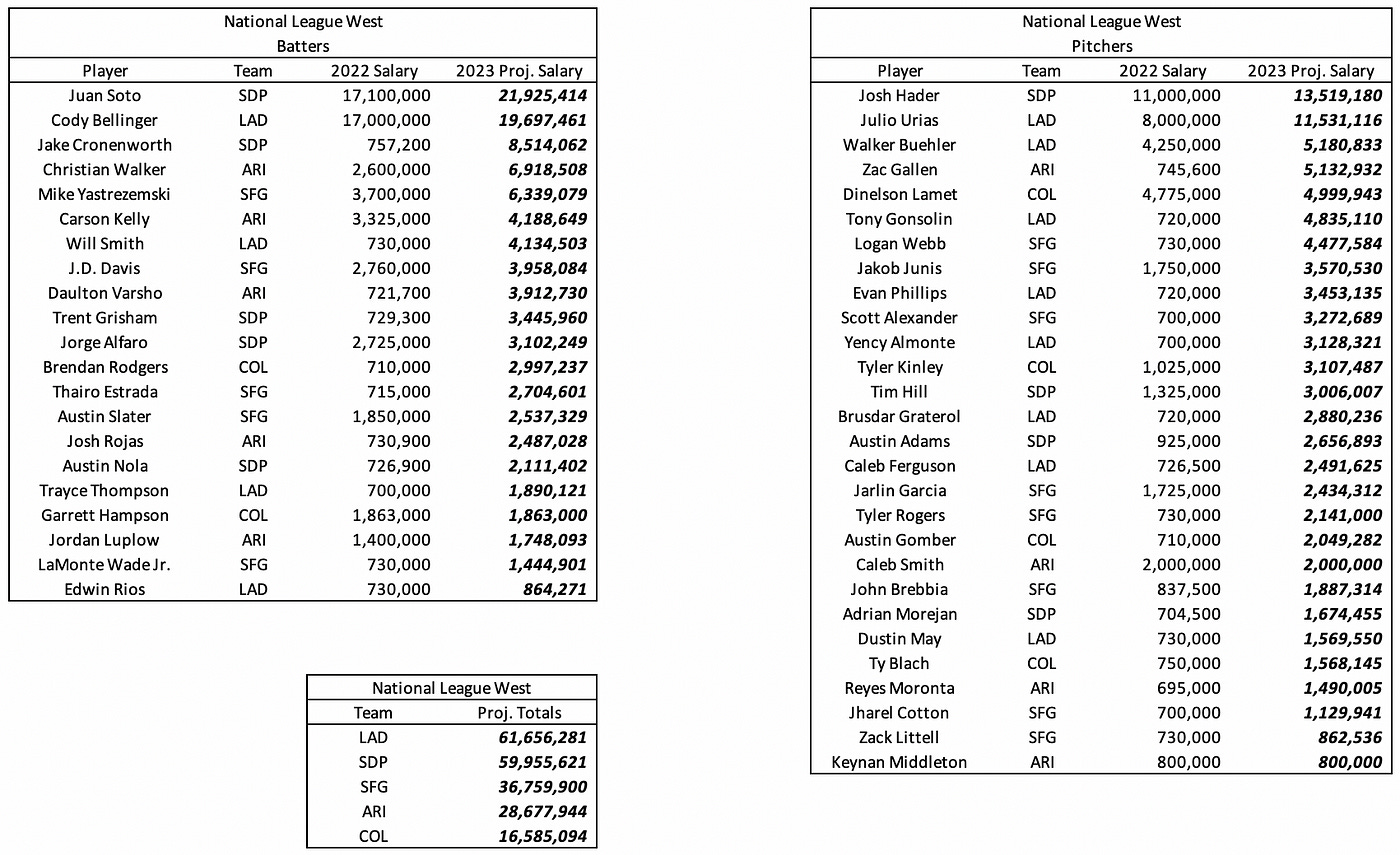 Below are the projected 2023 salaries for arbitration-eligible players in the National League West.