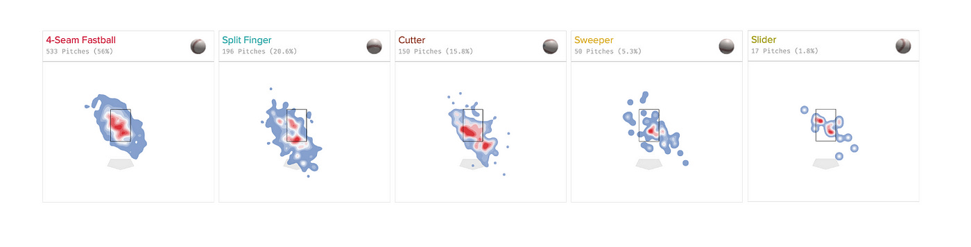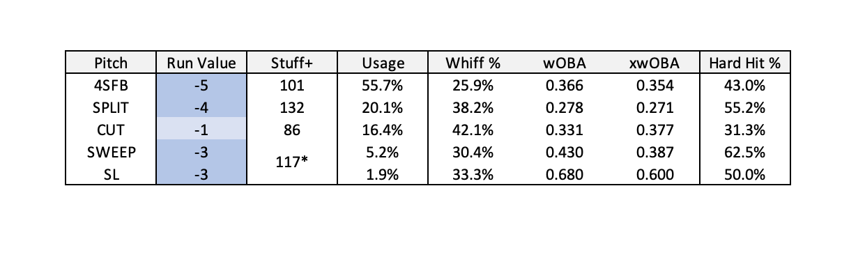 Shintaro Fujinami’s pitch arsenal primarily consists of five pitches: a Four Seamer, a Splitter, a Cutter, a Sweeper, and a Slider. Run Values indicate that all of Fujinami’s pitches are of negative value, while FanGraphs’s Stuff+ model is a fan of Fujinami’s Splitter and Sliders, believing that they are the best pitches in his arsenal.