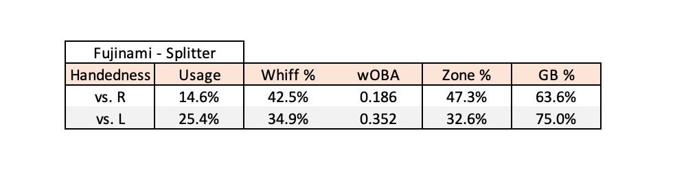 According to the table of Stuff+ leaders shown above, Fujinami’s Splitter has been the 6th-best Splitter in all of Major League Baseball this season. Given the high pitch modeling grade as well as the high amounts of Whiffs the pitch generates, it is fair to question why Fujinami only utilizes the pitch 20.1% of the time and easy to suggest that Fujinami utilize the pitch more often. A deeper dive into the frequency in which Fujinami throws Splitters to LHH and RHH paints a fuller picture into how and when he can adjust the usage of his Splitter in order to see better results.