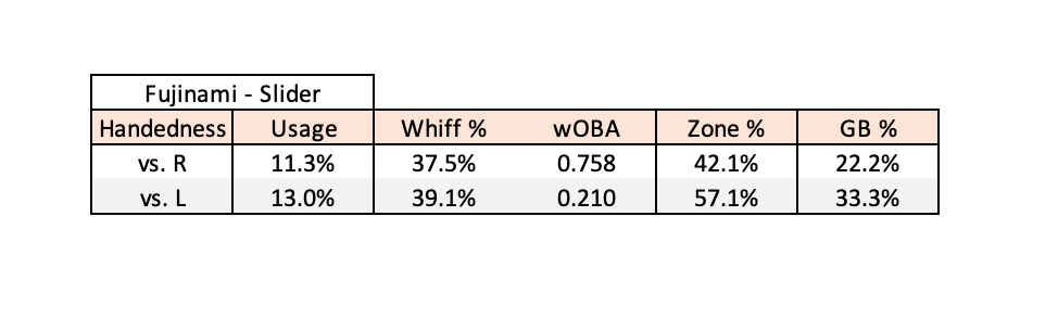 In place of increased usage of the Splitter, I would encourage Fujinami to stop utilizing his Slider, especially to right-handed hitters. As shown by the table above, right-handed hitters have been creating a lot of production against the Slider, with a .758 wOBA against the pitch. Left-handed hitters have experienced more difficulty against the Slider, producing a .210 wOBA and a 39.1% Whiff Rate against the pitch. For these reasons, I would recommend that Fujinami drop usage of his Slider (especially to RHH), and utilize primarily his Splitter alongside with his Four Seamer to opposing hitters in order to maximize his potential.