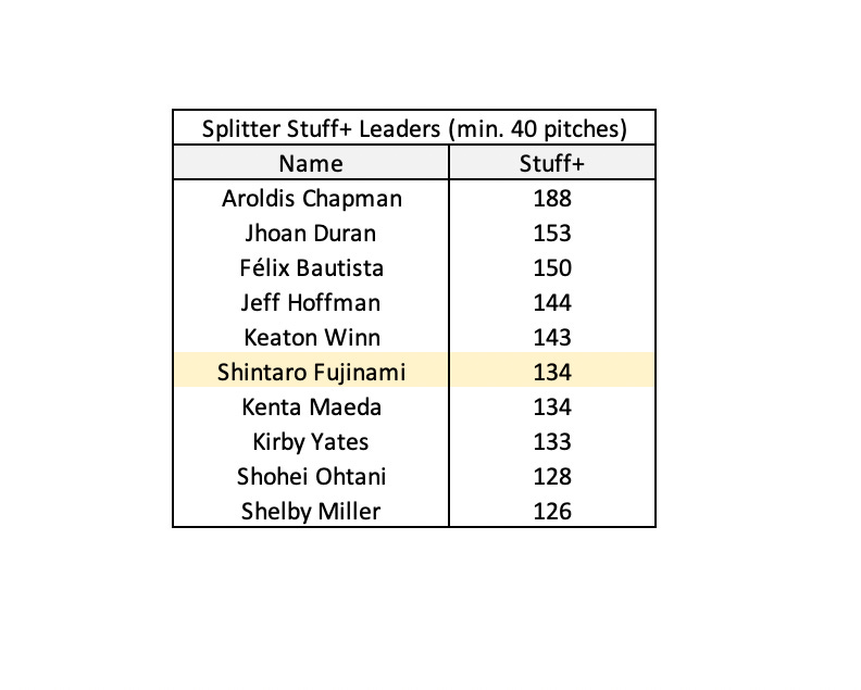 Another pair of adjustments that Shintaro Fujinami should make to his pitch arsenal in order to maximize his potential is to increase his Splitter usage and decrease usage of his Slider. As mentioned earlier, Fujinami’s Splitter is considered to be the best pitch in his entire arsenal according to FanGraphs’s Stuff+. Not only is the Splitter Fujinami’s best offerings, but it is also one of the best Splitters in all of Major League Baseball by measure of Stuff+.
