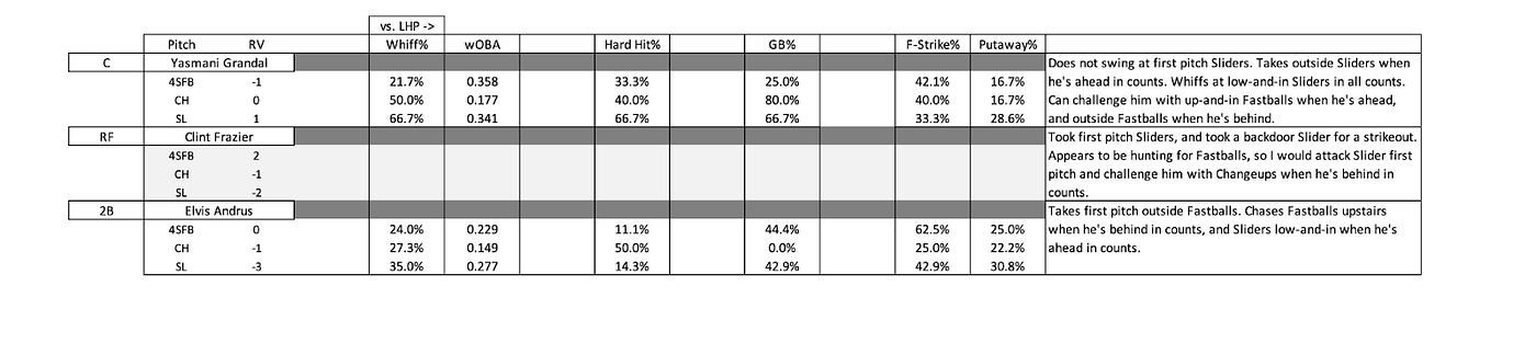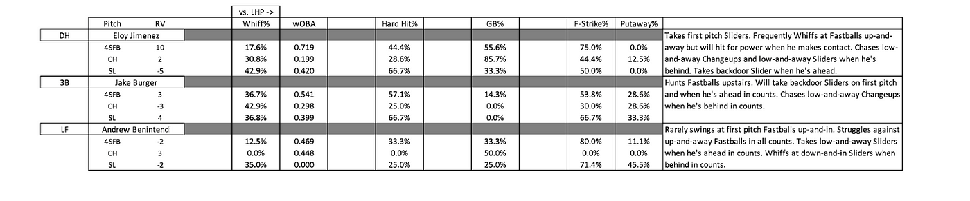 Clint Frazier joined the White Sox Major League roster at the end of May, so there is a small sample size available of him facing left-handed pitching this season. When he faced Clayton Kershaw earlier this month, it appeared that he was hunting Fastballs against the left-hander, as he took first-pitch Sliders and was caught looking for a strikeout on a backdoor Slider. Therefore, I would attack Frazier with a first-pitch Slider and challenge him with Changeups when he is ahead in counts.