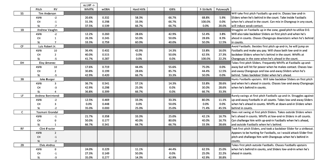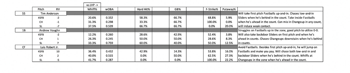 Luis Robert Jr. is a very good Fastball hitter, with a Run Value of 10 on the pitch against pitchers of both-handedness, as well as a .432 wOBA and 42.9% Hard Hit Rate on the pitch against left-handed pitchers. It appears that Robert hunts Fastballs against left-handed pitchers, as he does not have one Hard Hit against left-handed Changeups and Sliders. Besides utilizing the pitch on 0–0 up-and-in, Heaney should avoid Fastballs against Robert, utilizing Sliders when Robert is behind in the count and Changeups when Robert is ahead in the count.