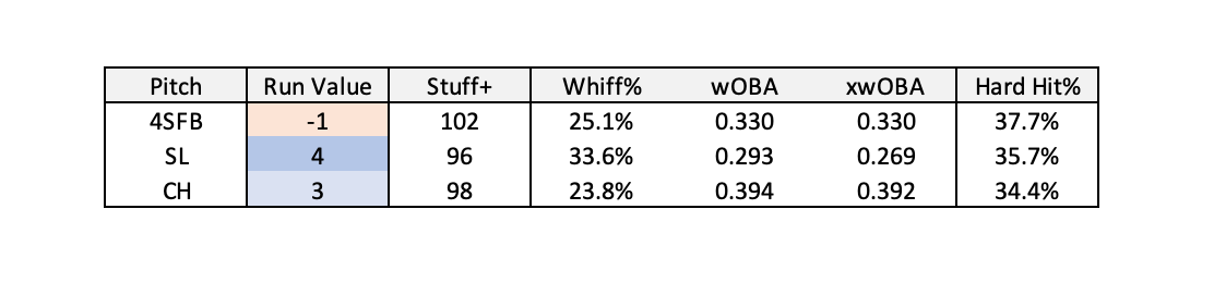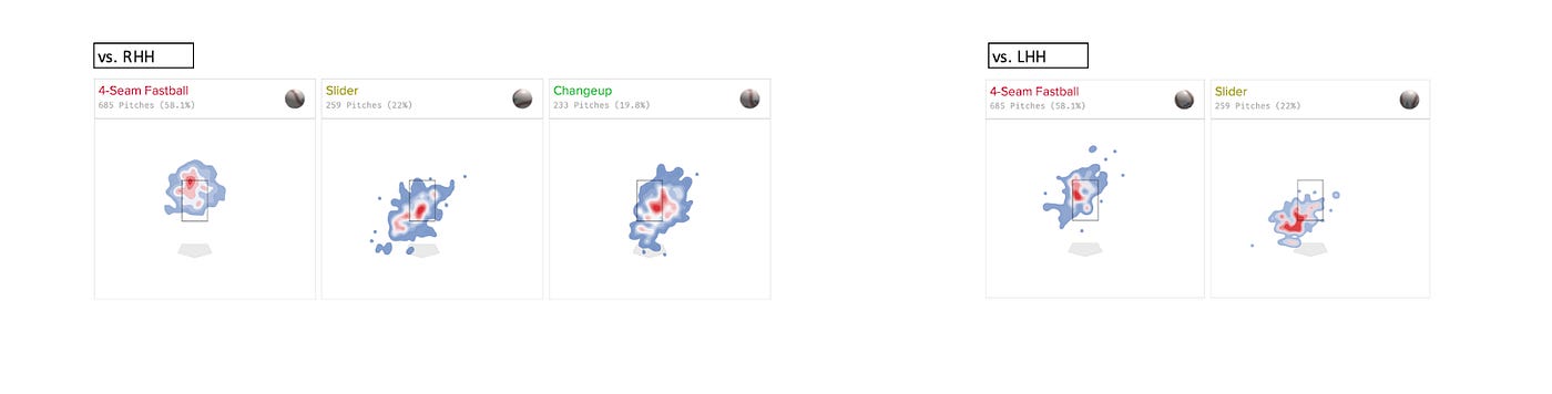 Andrew Heaney’s pitch arsenal consists of three pitches: a Four-Seam Fastball, a Slider, and a Changeup. According to Run Values and FanGraphs’s Stuff+ model, Heaney’s Fastball is his best pitch, followed by his Changeup and his Slider. Heaney utilizes all three pitches when facing right-handed hitters, and utilizes only the Four Seamer and the Slider when facing left-handed hitters.