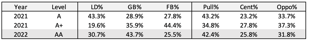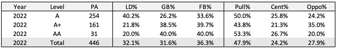 Throughout the 2022 season, Kavadas has had a nearly equal LD/GB/FB distribution, however it should be noted that after his promotion to High-A, a lot of fly balls that Kavadas was hitting previously turned into ground balls. As would be expected of a power hitter, Kavadas pulls the ball around 48% of the time, and hits the ball up the middle and to the opposite field around 26% each.